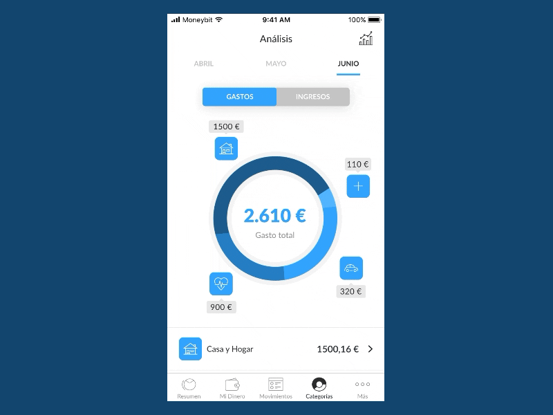 Moneybit also helps you to keep an eye on your expenses by category, set a monthly budget and see all your transactions, from all your accounts and credit cards, from an aggregated feed.